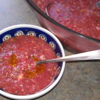 Cut larger tomatoes unto chunks and toss them into food processor or blender, add cherry and grape tomatoes as they are. Pulse until smooth with small chunks for texture. Transfer into a large bowl. Add chunks of cucumber, onion and green and/or chili pepper to processor and process until mostly smooth then add to bowl. Season with salt and pepper. Let sit 30 minutes or over night to blend flavors. Test for seasoning and add S & P if needed. Serve in a bowl with a drizzle of extra virgin olive oil or your favorite nut oil.