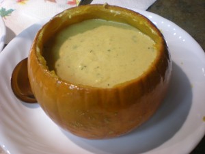 When cooled, scoop out flesh leaving 1/2 inch on the walls as you’ll be using this to serve the soup.