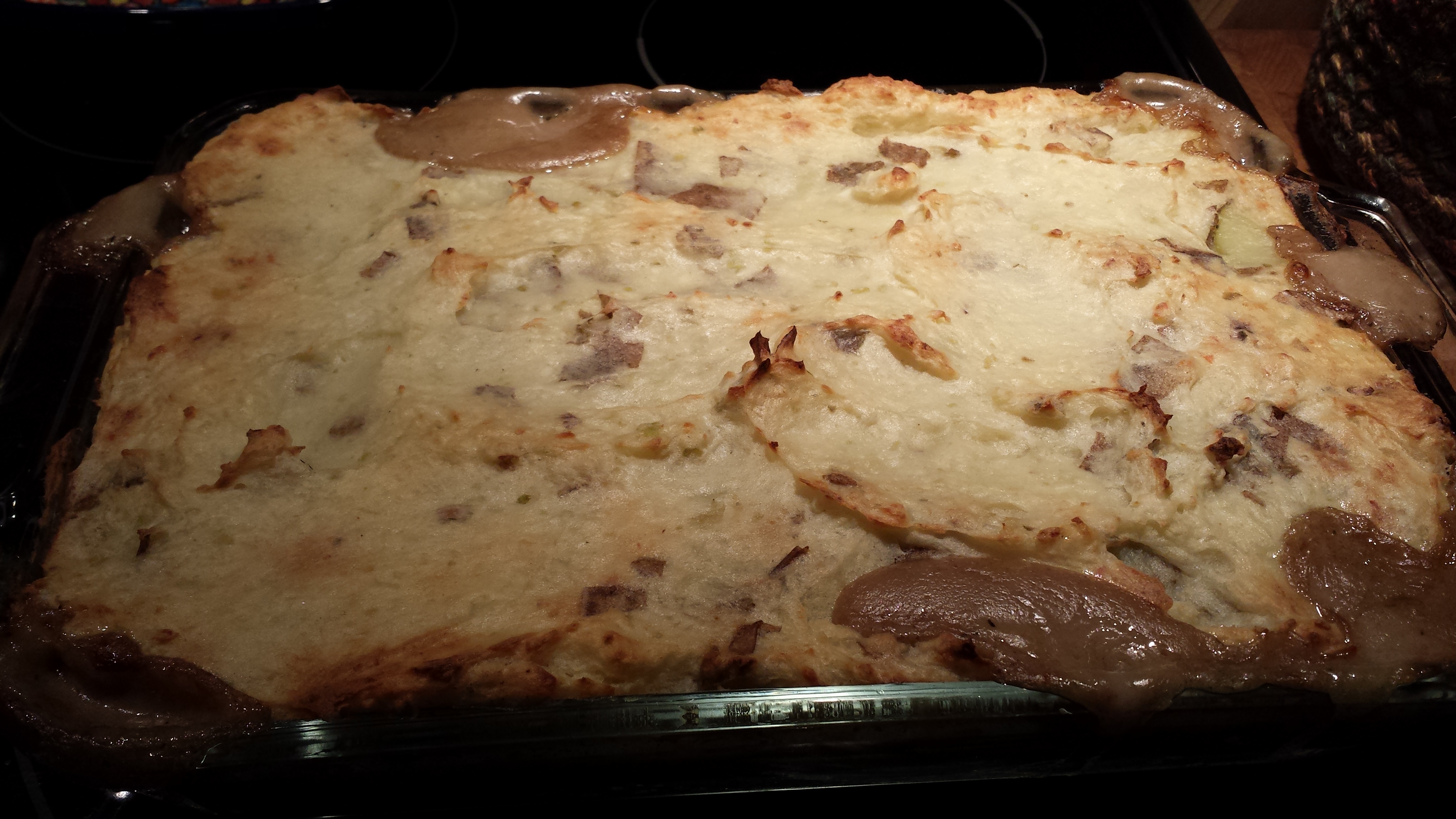 Mash potatoes with a little milk and butter…add frozen veggies to the meat mixture, toss to mix well…spread in a baking dish and top with potatoes. Bake @ 400° for 30-40 minutes until bubbly and browned.